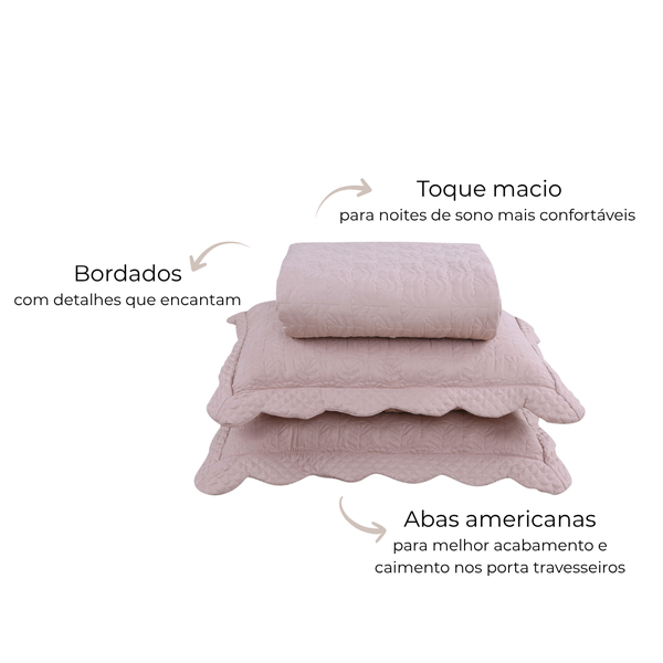Kit Colcha/Cobre Leito Requinte Solteiro Bordado - 1 Porta Travesseiro | Têxtil Arte - Rosa Dust